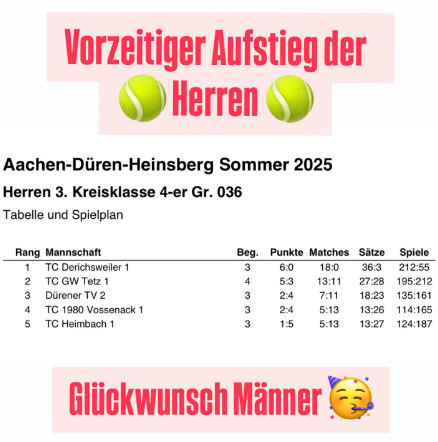 gestern ihre Sahnesaison mit dem Aufstieg in die Mittelrheinliga gekrönt und den TC Rheinbach mit 7:2 geschlagen.